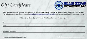 Gift certificates available in one month, single memberships. To redeem, the recipient must email membership@bluezonefitness.fit.