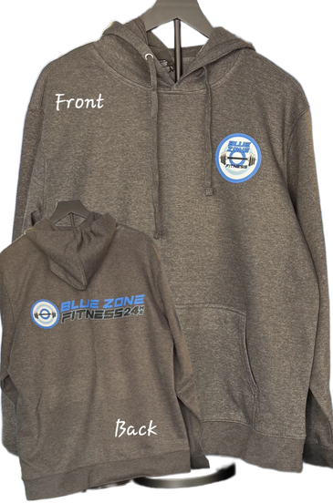 Blue Zone Fitness logo hooded sweatshirt in dark gray. Available in XS-4XL